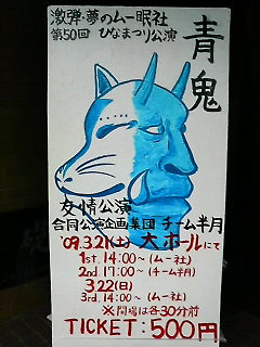 いわき明星大学激弾夢のムー眠社の方々、足を運んでくださいましたお客様、うちのスタッフさん、役者さん、ありがとうございましたっ。そしてお疲れ様でした! 主役が降板したのが、本番1ヶ月前。 稽古開始が2週間前。 音が決まったのが1週間前。 プランを書いたのが3日前。 舞台の広さがわかった本番1日前。動きを変更せざる終えなかった前日 演出、役者1名の小屋入り本番当日 鳴子音集まらず、袖でリアル音にすることに、本番7時間前。 オープニング映像完成が開演4時間前 オープニングの初練習(映像付き)開演1時間前 ここまで追い込まれたことはないですよ。はぃ。 まぁ…うまくいったといえばいったのでよいのですが。 アンケートにも野田秀樹氏の作品を見ているようだと書かれたり、コメディとシリアスの差がうまかったなど評判も上々だったようです。 もちろん、課題もあります。 テンポアップはよかったが、逆にやり過ぎで何が伝えたかったのかよくわからないという意見、役者がやりすぎだったなど評価もうけました。 やはり色んな方々が見ますからね。全てのお客様によかったと言われる作品作りは不可能に近いです。が、なんとかそれを可能にしてみたいものです。 今回の作品のテーマだったのが「心」 主役アオベイの豹変。 コメディとシリアスをはっきりさせるため 前半のテンポアップと笑いを入れる。 後半は少しテンポを落とし、前半よりも間を使う。 若干我の強い役者がいたため、後半部までギャグが浸透してしまったのが残念であったが。 あまり深くいくと各役者へのダメだしになってしまうので、ここでは自重。 さて、書きたいことが沢山ありすぎて困りますね。 1度きりの本番… みんなアドリブ多過ぎ… コン子!!またしても本番に飲酒…酔った勢いで客席に突っ込むし… 皆さん飲酒の女優に注意しましょう(汗) そんなわけで、 朝日新聞いわきスポーツ文化欄にチーム半月が取り上げられるそうです… えっ? そうです 終演後インタビュー(取材)をうけました!!! 大変ですっ どんな記事になるか大変気になっている市河優駿でした。
